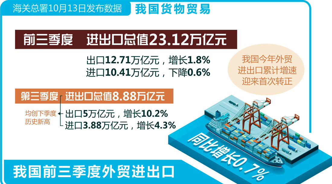 前三季度,貨物進(jìn)出口總額231151億元,同比增加0.7%,累計(jì)增速年內(nèi)初次由負(fù)轉(zhuǎn)正。