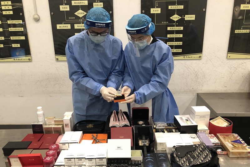 當(dāng)日,現(xiàn)場關(guān)員對入境旅客行李物品進行查驗時發(fā)現(xiàn),2名旅客的行李機檢圖像異常。開箱后發(fā)現(xiàn)行李箱中滿滿當(dāng)當(dāng)裝著各種名牌奢侈品和化妝品。其中蛋卷盒和餅干盒里藏著“卡地亞”“萬國”手表,此外行李箱里還裝著“迪奧”“賽琳”背包,“香奈兒”女鞋,“蘋果”手機,“迪奧”“蘭蔻”“黛珂”護膚品等奢侈品和化妝品。經(jīng)清點,累計有90件。
